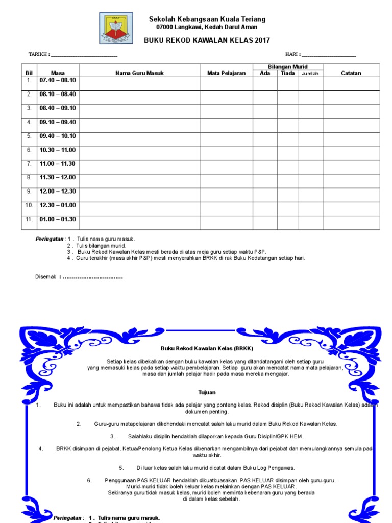 Buku rekod kedatangan murid merupakan dokumen penting di sekolah, guru yang pernah menjadi guru kelas pasti menjaganya dengan teliti terima kasih diucapkan kepada guru yang menghasilkan template excel buku rekod kedatangan ini. Mengurus dan memestikan bilik rawatan dan peti ubat disediakan serta dilengkapi. Kepada yang berminat bolehlah memuat trun sekarang. · buku pengurusan sekolah tahun. Buku rekod pergerakan guru dan ppm 15. Cara mengisi buku rekod kesihatan murid unitkesihatansekolah pkdhululangat ss iillaa iiss ii ss eemmuuaa mmaakklluummaatt mmeenngggguunnaakkaann pp eenn bahagiani( page3)… Pelaksanaan aktiviti kelab doktor muda sekolah menengah bermula pada tahun 2015 berkonsepkan 'dari murid, untuk murid, kepada murid'. Buku pink merah untuk mencatat perkembangan ibu dan bayi dalam kandungan. Pada 18 november 2009, pihak sekolah telah mengadakan satu sesi menandatangi buku rekod prestasi murid. Pengagihan buku teks spbt kepada murid. Bidang kurikulum, kokurikulum dan hal ehwal murid diurus secara cekap dan berkesan untuk melahirkan murid yang seimbang dari segi intelek, rohani, emosi, jasmani dan sosial selaras dengan hala tuju sekolah. Contoh format rekod buku log masalah disiplin murid. Sila kembalikan kepada guru kelas setelah dilengkapkan sebelum 25 januari 2017.